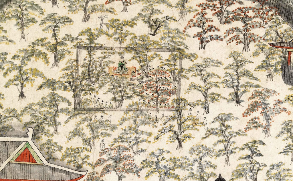 | ▲ 조선시대 탐라순력도 '귤림풍악' 일부분 (제주=연합뉴스) 조선 숙종 1702년 제주목사로 부임한 이형상이 화공 김남길에게 남기도록 한 채색 화첩 '탐라순력도' 귤림풍악의 일부분을 확대한 그림. 귤나무숲에서 목사가 풍악을 즐기는 모습이 담겨있다. 2021.11.7 [제주도 제공, 재판매 및 DB 금지] |