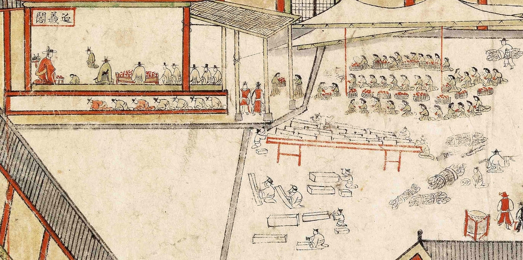 그림을 보면 망경루 앞뜰에서 여인들이 귤을 종류별로 나누고 있고, 이형상 목사는 연회각에 앉아 이를 일일이 점검하고 있다.