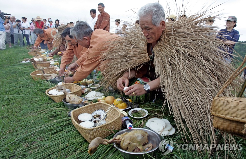 | ▲ 풍요로운 목축 기원 `테우리 고사' (제주=연합뉴스) 지난 2004년 8월 27일 제주도 북제주군 송당마을 아부오름에서 마을 주민들이 풍요로운 목축을 기원하는 '테우리 고사'를 지내고 있다. [연합뉴스 자료사진] |