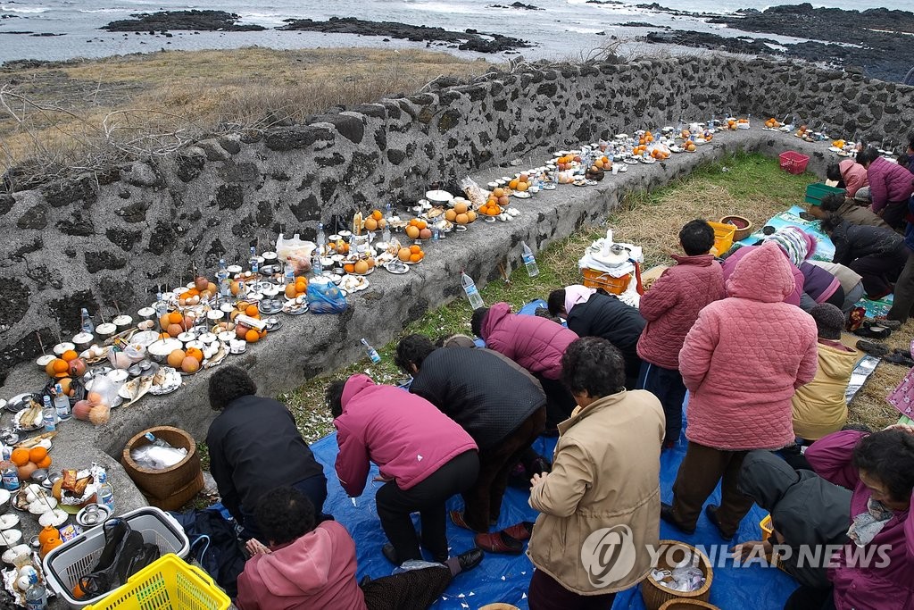| ▲ 제 지내는 해녀들 (제주=연합뉴스) 지난 2016년 11월 30일 제주시 구좌읍 하도리 각시당에서 해녀들이 무사안녕을 기원하며 바다의 신 용왕에게 제를 지내고 있다. [제주특별자치도 해녀박물관 제공=연합뉴스] |