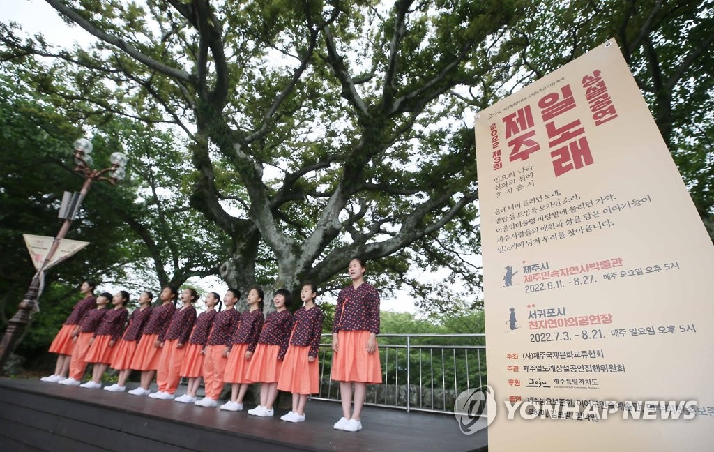 ▲ 어린이들이 부르는 제주 일노래 (제주=연합뉴스) 지난 6월 11일 오후 제주민속자연사박물관 앞마당에서 진행된 2022 제주 일노래 상설공연에서 어린이들이 제주도민의 삶과 애환이 담긴 제주 일노래(노동요)를 도민과 관광객들에게 선보이고 있다. [연합뉴스 자료사진]