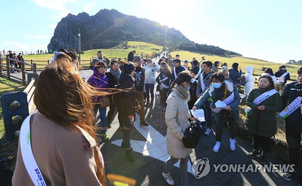| ▲ "기초질서 지켜요" (서귀포=연합뉴스) 지난 2016년 11월 24일 제주 서귀포시 성산일출봉에서 도내 대학교에 다니는 중국인 등 외국인 유학생들이 관광객들을 대상으로 기초질서 지키기 캠페인을 벌이고 있다. 2016.11.24 atoz@yna.co.kr |