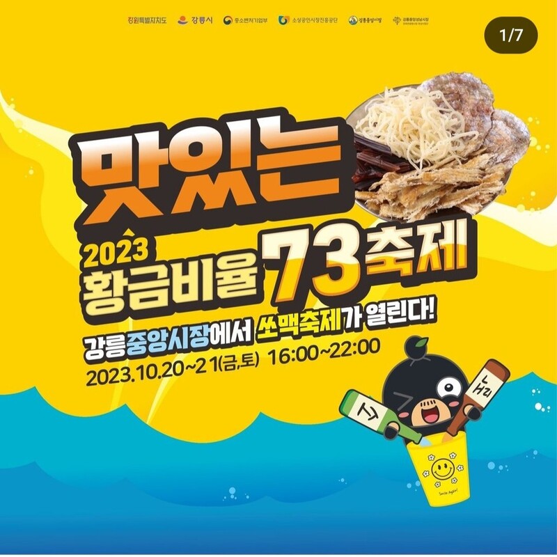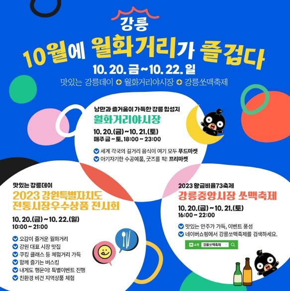 19일 강릉시에 따르면 '강원 전통시장 우수상품 전시회'가 구 한전 옆 월화거리에서 20∼22일 펼쳐지며, 20∼21일에는 월화거리야시장이 오후 6시부터, 2023 황금비율 7:3 쏘맥축제가 강릉중앙시장에서 오후 4시부터 각각 펼쳐진다.