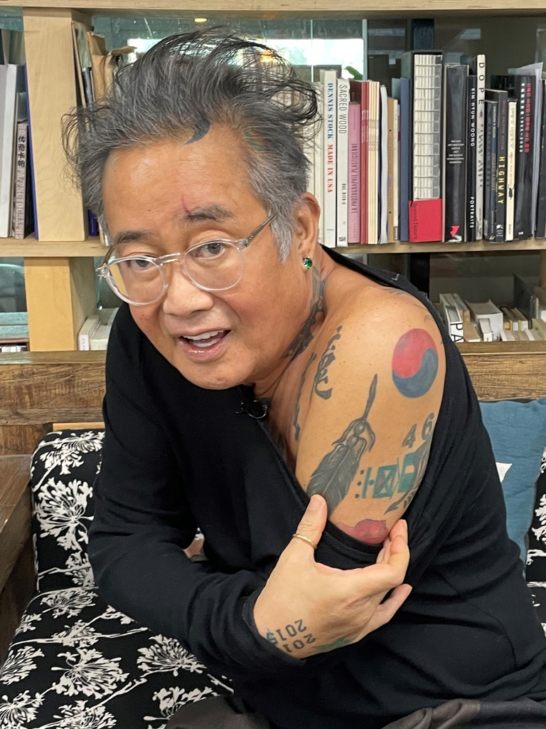 | ▲ 어깨 보여주는 김중만 작가 (서울=연합뉴스) 김선민 인턴 = 김중만 작가가 서울 성동구 자신의 스튜디오에서 연합뉴스와 인터뷰 도중 어깨의 문신을 보여주고 있다. 김 작가는 '46'은 천안함 46용사를 기억하기 위해 새긴 것이라고 설명했다. 2022.1.19 juliakim0925@yna.co.kr |