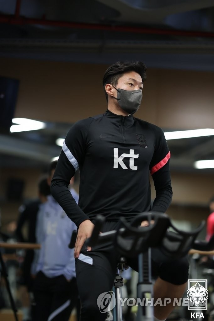 | ▲  South Korean men's national football team forward Hwang Ui-jo rides a stationary bike at Wyndham Grand Istanbul Europe in Istanbul on Jan. 24, 2022, in this photo provided by the Korea Football Association. (PHOTO NOT FOR SALE) (Yonhap) |