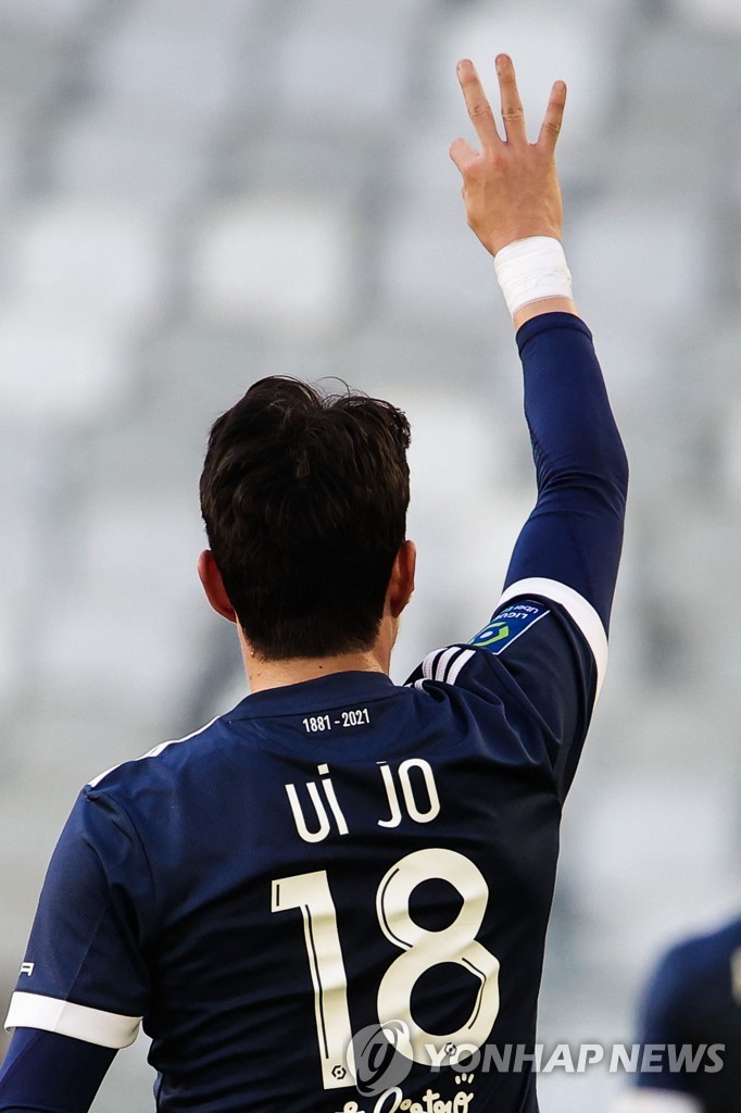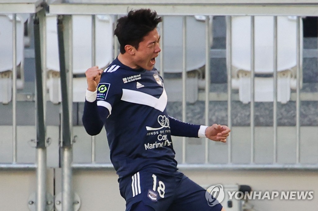 | ▲  In this AFP photo, Hwang Ui-jo of FC Girondins de Bordeaux celebrates a goal against RC Strasbourg Alsace during a Ligue 1 match at Matmut Atlantique in Bordeaux, France, on Jan. 23, 2022. (Yonhap) |