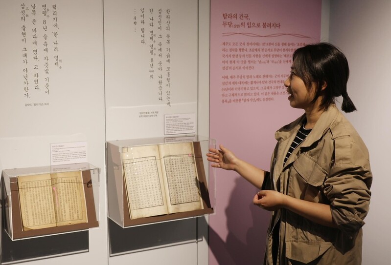 | ▲ 탐라빈흥록의 중요성 설명하는 김나영 학예사 (제주=연합뉴스) 변지철 기자 = 김나영 제주민속자연사박물관 학예사가 지난 5일 특별전시실에서 탐라 건국시기에 관한 기록이 담긴 '탐라빈흥록'(耽羅賓興錄)의 중요성을 설명하고 있다. 2023.10.27 |