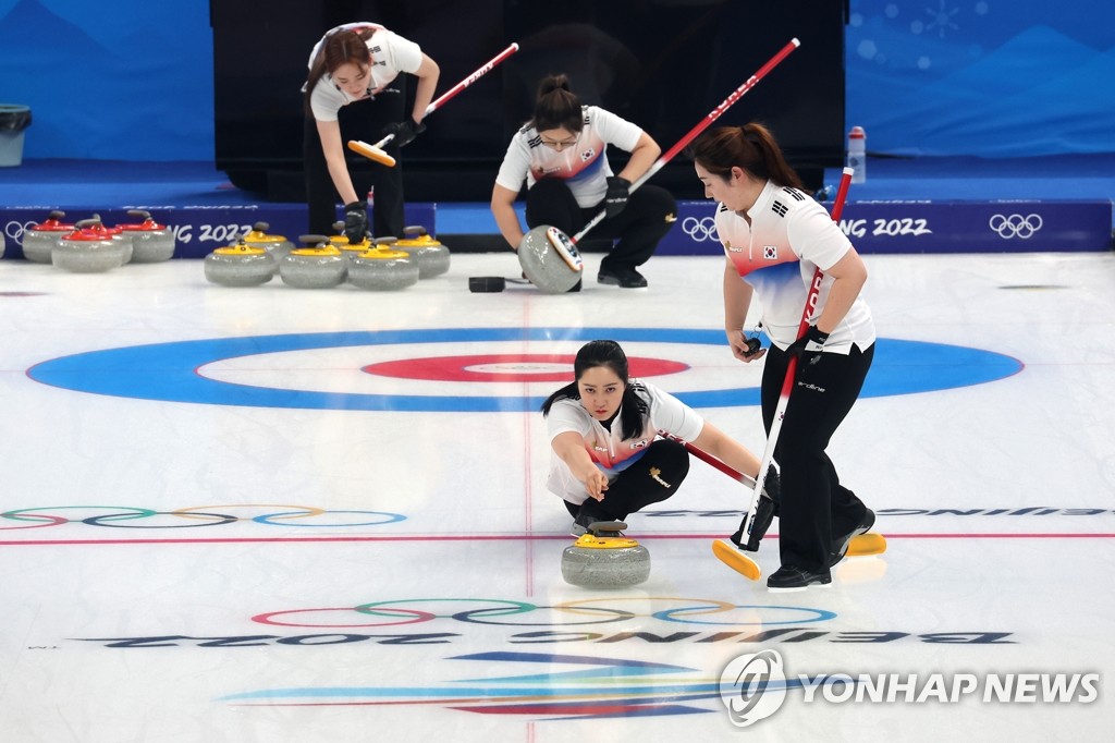 | ▲ Members of the South Korean women's curling team at Beijing 2022 practice at the National Aquatics Centre in Beijing on Feb. 9, 2022. (Yonhap) |