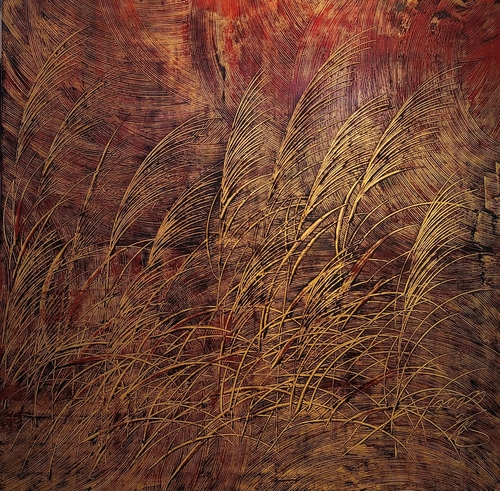 "그동안 옻칠에 관심 없는 우리 젊은이들에게 옻칠을 알리기 위해 꽃 등을 다양하게 그렸는데 마음 한구석에 늘 허전함이 있었죠. 과감하게 3년 전 결심을 굳히고 갈대만 그리기로 했어요. 갈대는 바람 속에서도 쓰러지지 않고 존재 가치를 지니죠. 그리고 갈대만으로도 수많은 텍스처와 테크닉을 표현할 수 있습니다."