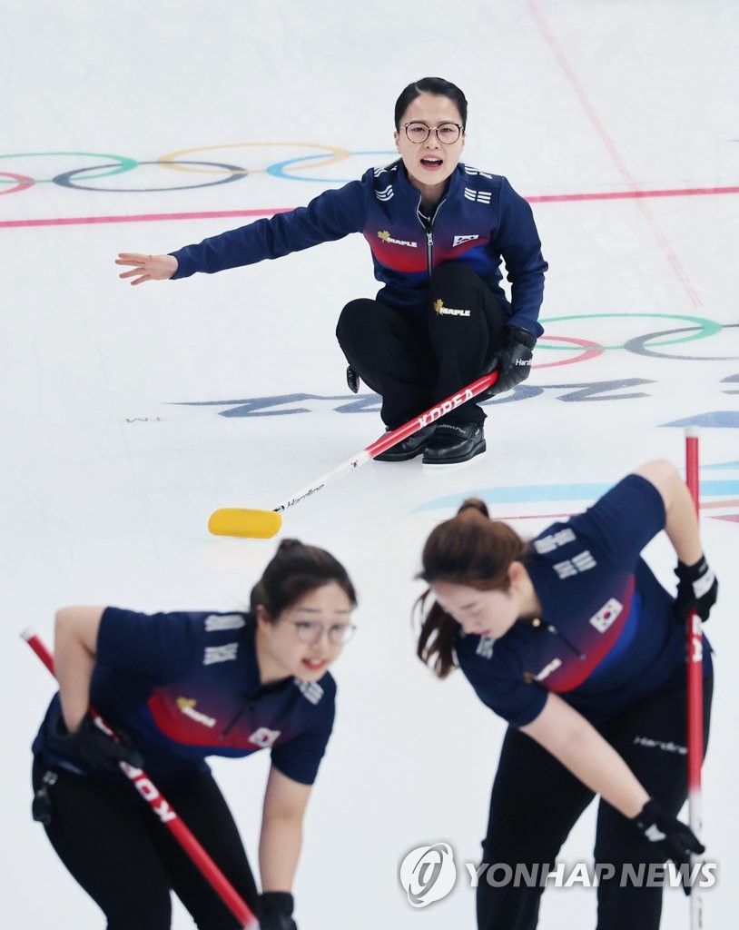 | ▲ South Korean skip Kim Eun-jung (C) yells out directions to her teammates Kim Seon-yeong (L) and Kim Yeong-mi during a round-robin game in the women's curling tournament against China at the Beijing Winter Olympics at the National Aquatics Centre in Beijing on Feb. 13, 2022. (Yonhap) |