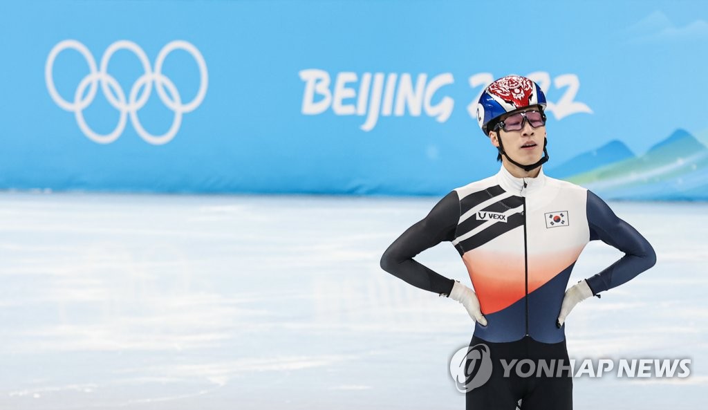 | ▲ Hwang Dae-heon of South Korea reacts to his disqualification from the men's 500m short track speed skating semifinal heat at the Beijing Winter Olympics at Capital Indoor Stadium in Beijing on Feb. 13, 2022. (Yonhap) |