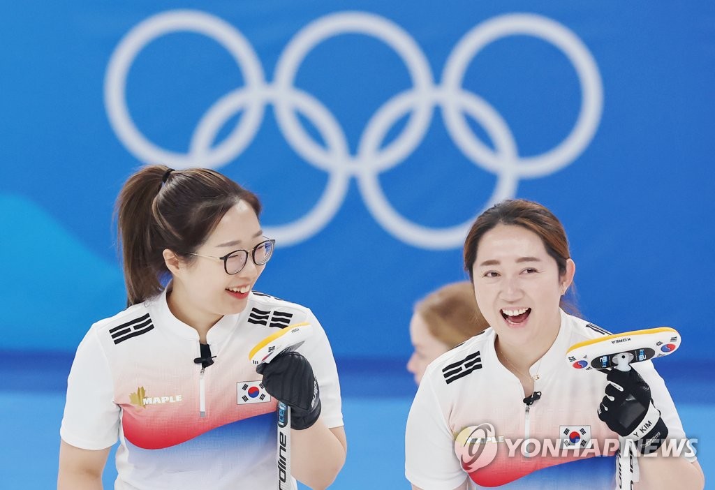 | ▲ South Korean curlers Kim Seon-yeong (L) and Kim Yeong-mi smile during a women's curling round-robin match against Japan at the Beijing Winter Olympics at the National Aquatics Centre in Beijing on Feb. 14, 2022. (Yonhap) |