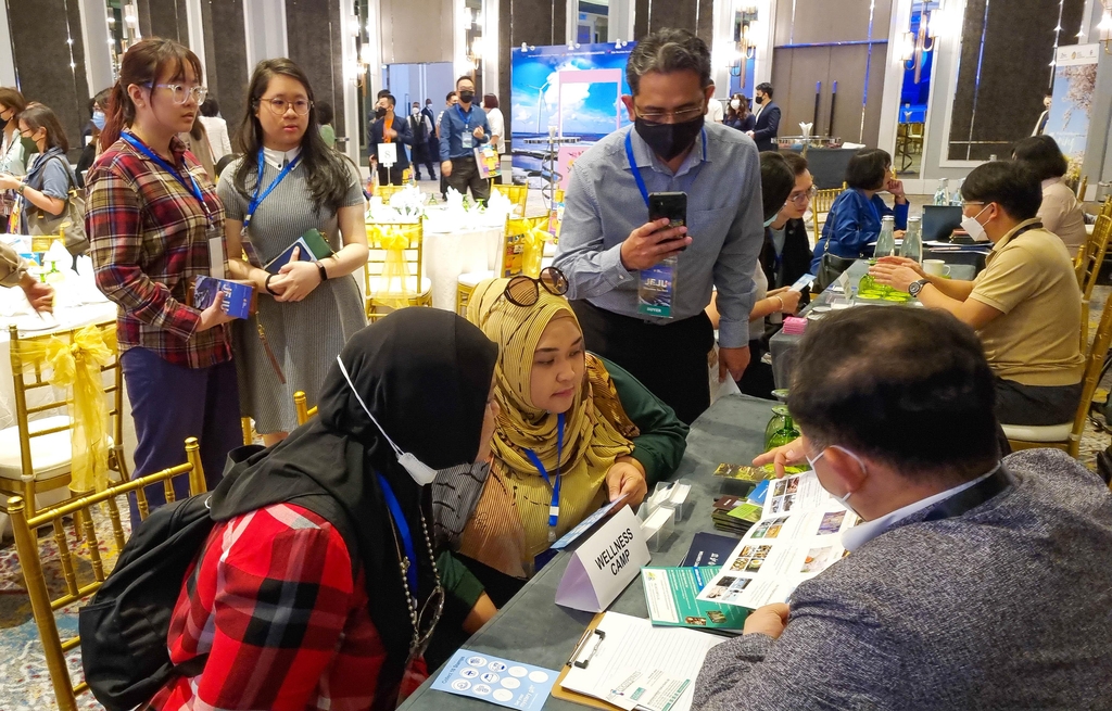 | ▲ "제주로 오세요" 관광 설명회 (쿠알라룸푸르=연합뉴스) 변지철 기자 = 현지시각으로 지난 7일 오전 말레이시아 수도 쿠알라룸푸르 JW 메리어트 호텔에서 진행된 '말레이시아 주요도시 제주관광 설명회'에서 제주지역 관광업체들이 현지 여행업체들에게 제주관광을 설명하고 있다. 2022.12.12 |