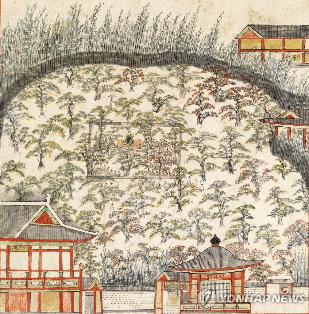 ▲ 조선시대 탐라순력도 '귤림풍악' (제주=연합뉴스) 조선 숙종 1702년 제주목사로 부임한 이형상이 화공 김남길에게 남기도록 한 채색 화첩 '탐라순력도' 귤림풍악. 귤나무숲에서 제주목사가 풍악을 즐기는 모습이 담겨있다. [제주도 제공]