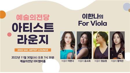 ▲ 비올라로 꾸미는 예술의전당 '아티스트 라운지' = 예술의전당은 오는 30일 IBK챔버홀에서 비올라의 매력을 한껏 즐길 수 있는 '아티스트 라운지' 무대를 마련한다.