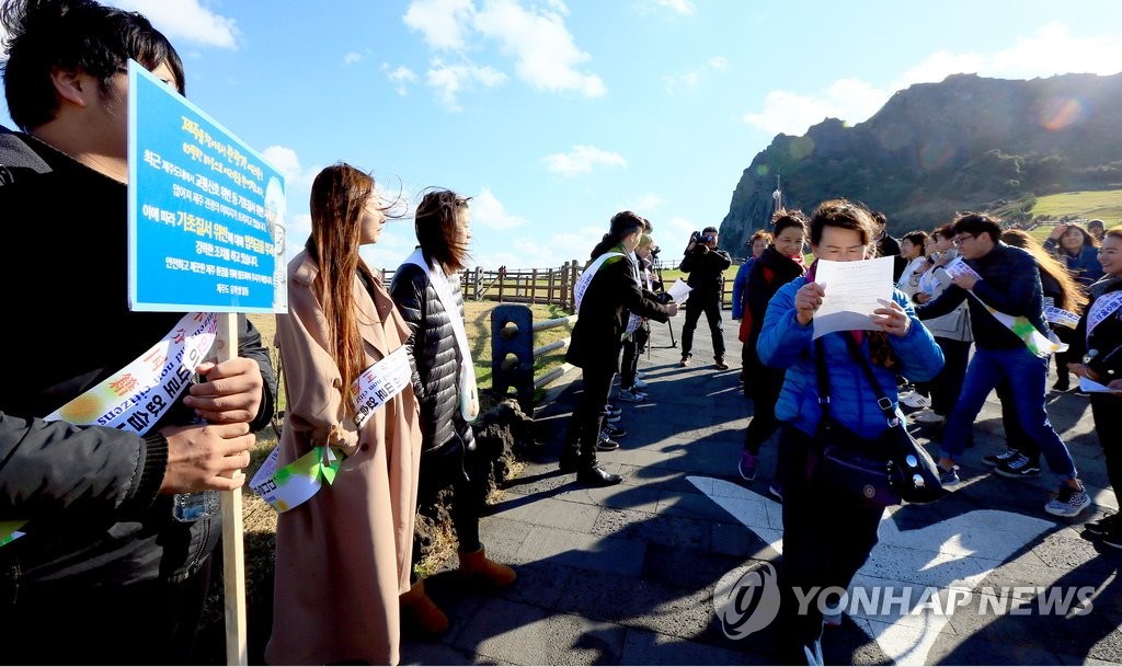 | ▲ "기초질서 지켜요" (서귀포=연합뉴스) 지난 2016년 11월 24일 제주 서귀포시 성산일출봉에서 도내 대학교에 다니는 중국인 등 외국인 유학생들이 중국 관광객들을 대상으로 기초질서 지키기 캠페인을 벌이고 있다. [연합뉴스 자료사진] |