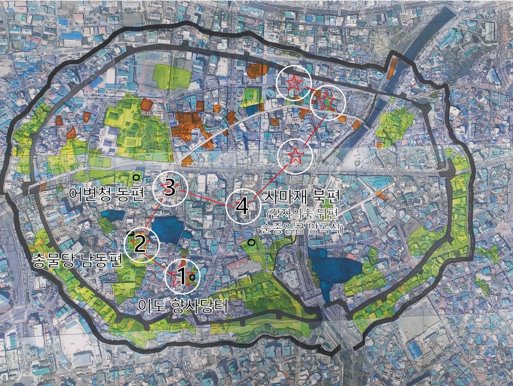 | ▲ 칠성대 위치가 표기된 '제주성내고적도' (제주=연합뉴스) 1900년대를 전후한 시기 제작된 홍종시의 '제주성내고적도'(濟州城內古蹟圖)의 일부분. 빨간색 실선으로 노랗게 표시된 부분이 북두칠성 모양의 칠성대가 있었던 위치다. 최근 칠성대 유적이 발견된 지역은 지도 하단의 1번 지역이다. 2023.8.20 [제주도시재생센터 제공, 재판매 및 DB 금지] |