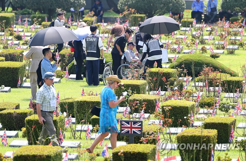 | ▲ 부산에 잠든 전우 찾은 유엔참전용사 (부산=연합뉴스) 손형주 기자 = 27일 오전 부산 남구 유엔기념공원에서 정전70주년을 맞아 한국에 방한 중인 6·25전쟁 유엔 참전용사들이 전우의 묘역을 참배하고 있다. 2023.7.27 handbrother@yna.co.kr |