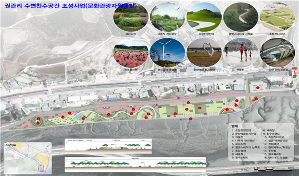 권관리 수변 친수공간에는 다목적 잔디광장·야외 공연장 등이 들어서며, 캠핑장에는 오토캠핑 32면·카라반 7면 등 39면 규모의 캠핑 공간과 편의시설이 마련된다.