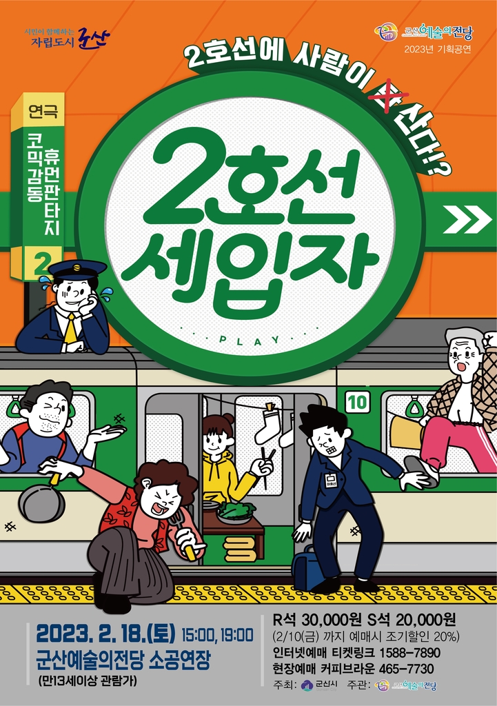 '연극 2호선 세입자'의 관람료는 R석 3만원, S석 2만원으로 2월 10일까지 20% 할인한다.티켓링크(www.ticketlink.co.kr)에서 예약할 수 있고 자세한 사항은 군산예술의전당 홈페이지(www.gunsan.go.kr/arts/)를 통해 확인할 수 있다.