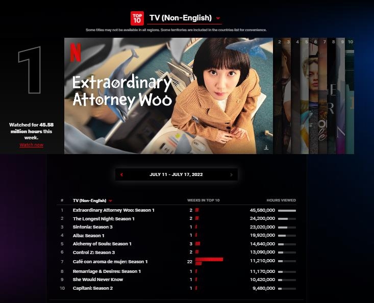 20일 넷플릭스 공식 사이트 '넷플릭스 톱(TOP) 10'에 따르면 '이상한 변호사 우영우'은 7월 셋째 주(11∼17일) 시청 시간 4천558만 시간을 기록해 비영어권 드라마 부문 정상에 올랐다.