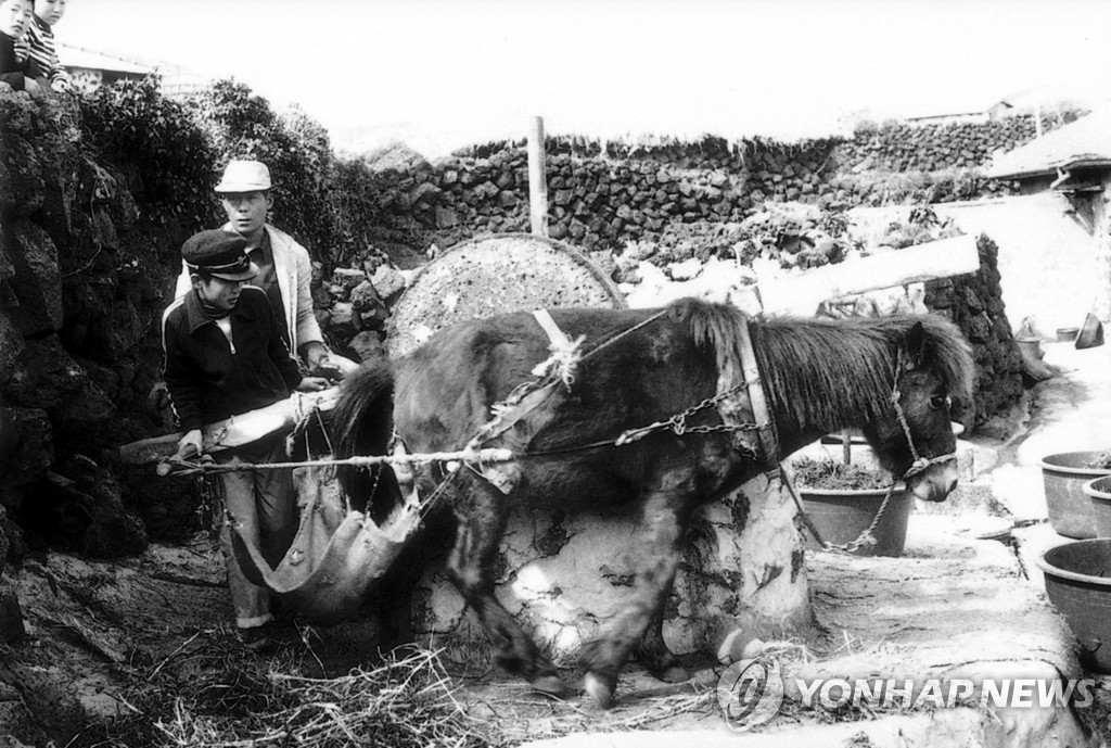 | ▲ 연자방아 돌리는 아버지와 아들 (제주=연합뉴스) 제주에서 말을 이용해 아버지와 아들이 연자방아를 돌리고 있는 모습. <<'사진으로 보는 제주역사'에서 발췌>> 2009.6.29. khc@yna.co.kr |