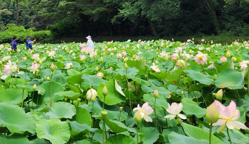 (보은=연합뉴스) 충북 보은 속리산국립공원 입구의 연꽃단지가 연분홍 연꽃으로 물들었다.
