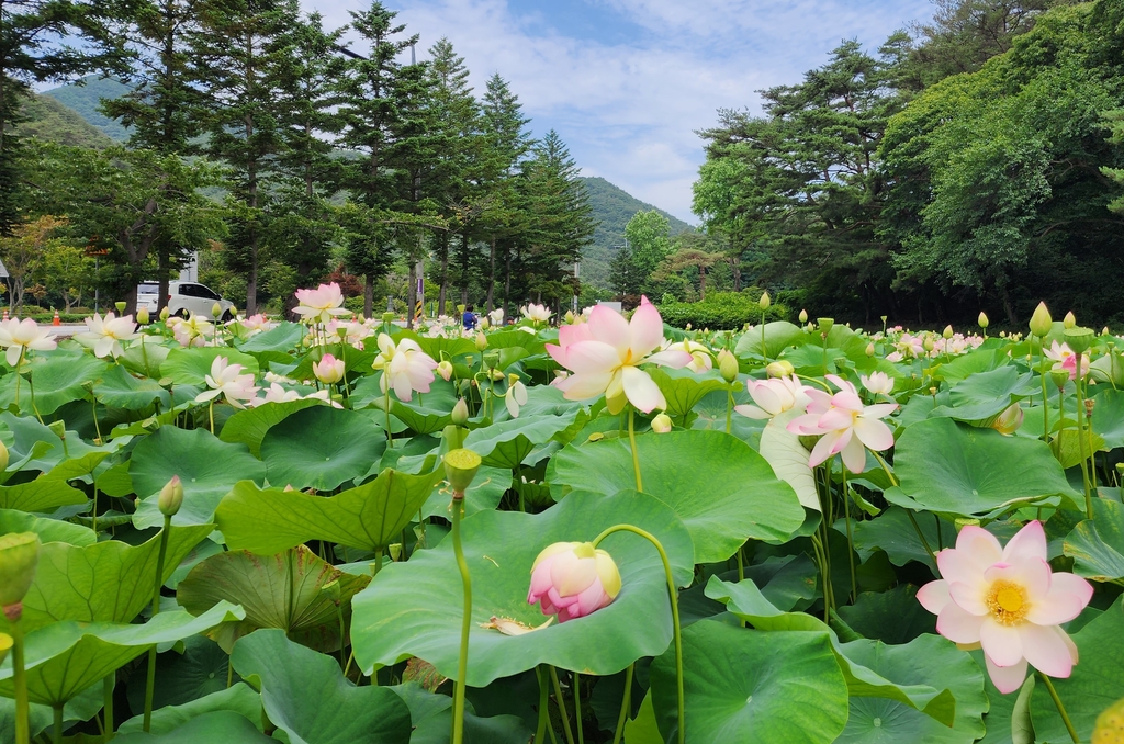 8일 보은군에 따르면 정이품송(천연기념물 103호) 인근 1만6천㎡에 조성된 연꽃단지에 최근 수천 송이의 연꽃이 만개해 관광객을 유혹하고 있다.