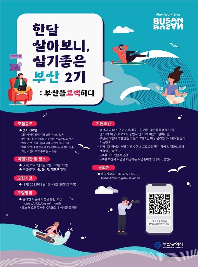 부산시는 '한 달 살아보니, 살기 좋은 부산' 2기 참가자를 8월 1일부터 20일까지 온라인(https://bit.ly/busan1month)으로 모집한다고 31일 밝혔다.