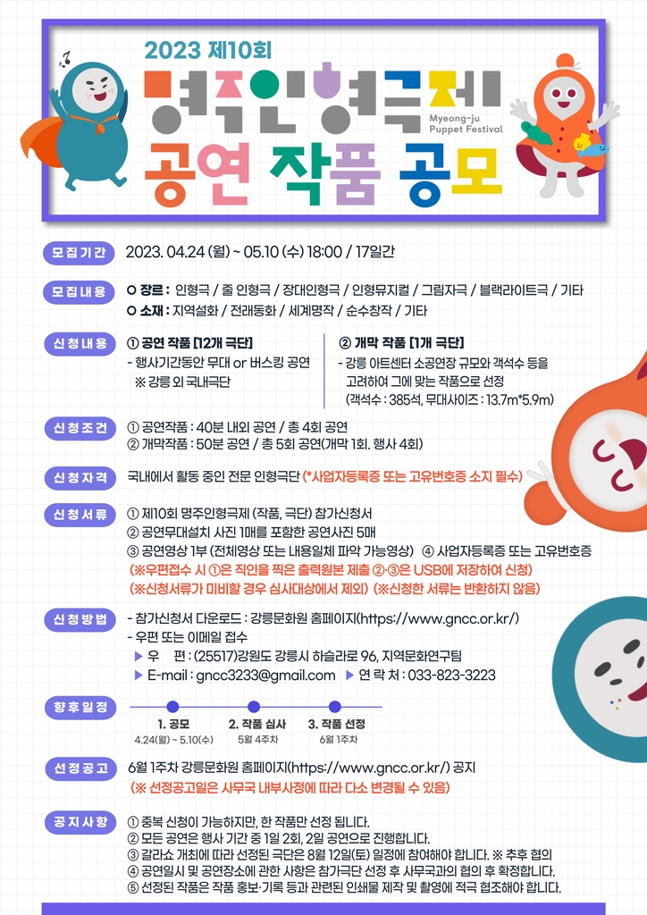 명주인형극제 측은 줄인형극, 장대인형극, 인형뮤지컬, 그림자극, 블랙라이트극 등 다양한 장르 및 소재의 작품을 선정할 예정이다.