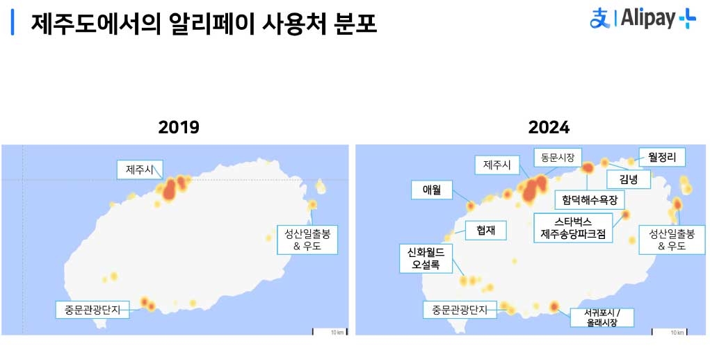 특히 제주에서도 코로나19 이전 제주시와 중문관광단지, 성산일출봉 일대에 집중됐던 알리페이 사용처가 올해 들어 동문시장과 애월, 월정리, 함덕해수욕장, 협재, 서귀포 올레시장 등으로 늘어났다.