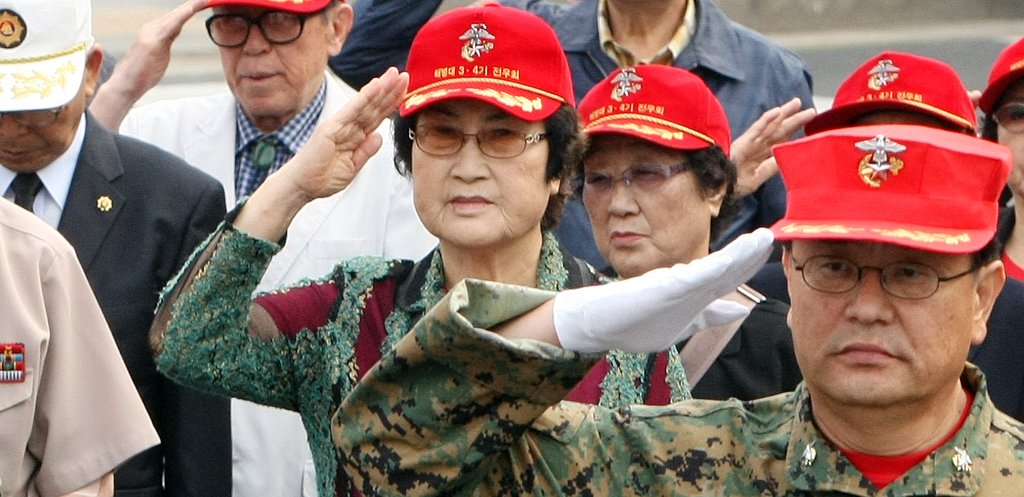 | ▲ 한국 최초 여군의 경례 (제주=연합뉴스) 제58회 현충일을 맞은 2013년 6월 6일 오전 해병대 4기 전우회의 한국 최초 여군들이 제주시 동문로터리 '해병혼탑'에서 열린 추모식에서 전사한 제주해병 전우들에 대해 경례하며 넋을 위로 하고 있다. 이들은 육군내 여군 창설 시기인 1950년 9월보다 조금 앞서 해병에 입대, 한국전에 참가했다. [연합뉴스 자료사진] |
