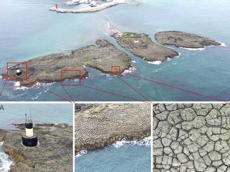 | ▲ '포항 오도리 주상절리' 모습 '포항 오도리 주상절리' 전경과 등대(A), 주상절리 수직면(B), 주상절리 육각기둥의 단면(C)을 비교한 사진 [문화재청 제공. 재판매 및 DB 금지] |