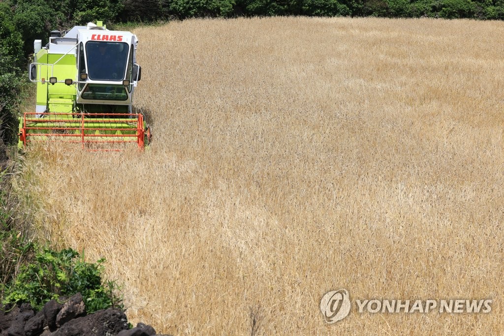 | ▲ 제주는 보리 수확철 (제주=연합뉴스) 지난 5월 23일 오전 제주시 한림읍 금악리의 한 밭에서 농민들이 콤바인을 이용해 보리를 수확하고 있다. [연합뉴스 자료사진] |