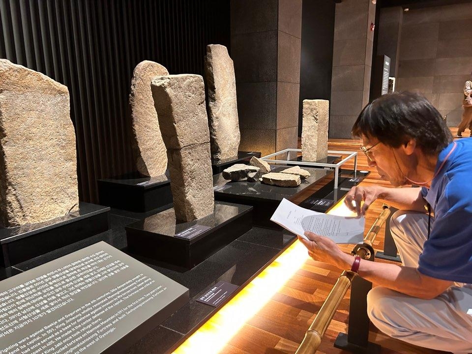 | ▲ 신라 비석을 살피는 박홍국 위덕대 연구교수 (경주=연합뉴스) 김예나 기자 = 박홍국 위덕대 연구교수가 국립경주박물관에 전시된 경주 남산 신성비(新城碑) 등을 살펴보고 있다. 2023.7.12 yes@yna.co.kr |