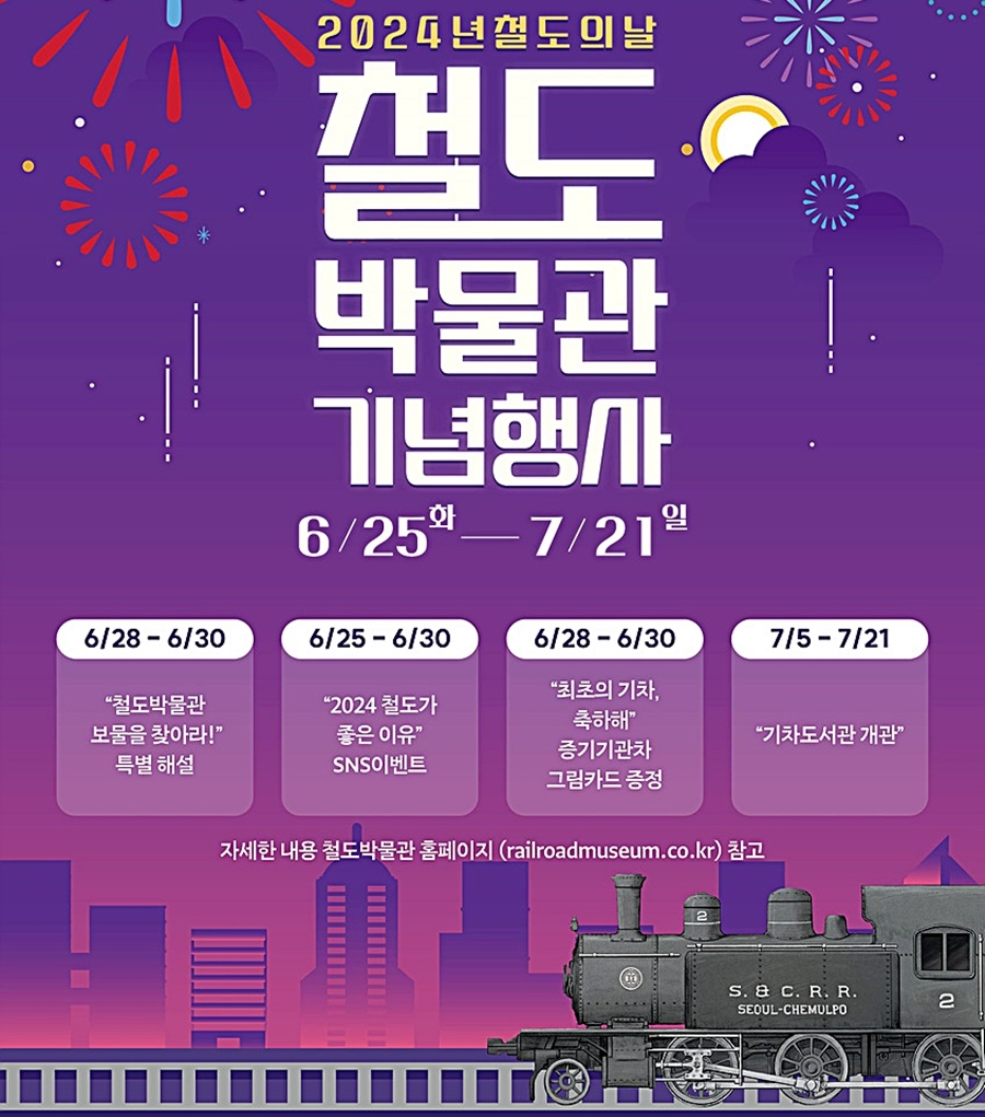 철도박물관은 28일부터 3일간 ▲ 특별해설 '철도박물관 보물을 찾아라' ▲ 소셜미디어(SNS) 이벤트 '2024 철도가 좋은 이유' ▲ 증기기관차 그림카드 배부 등 다양한 행사를 펼친다.