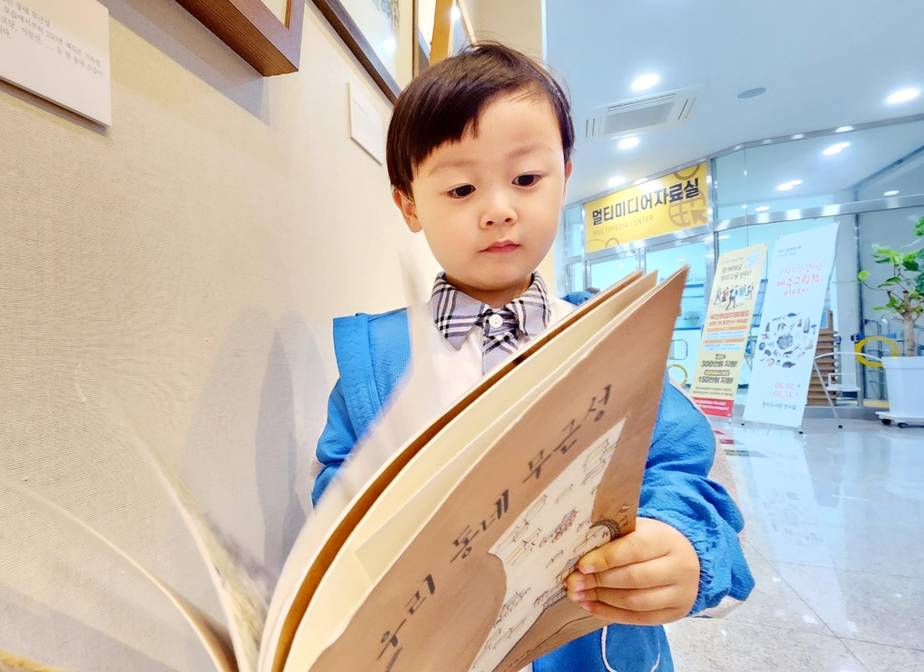| ▲ 전시회에서 그림책 보는 어린이 (제주=연합뉴스) 변지철 기자 = 지난 5일 제주한라도서관 1층 전시실에서 제주그림책연구회 창립 20주년 기념 전시회를 찾은 어린이가 그림책을 보고 있다. 2023.6.11 |