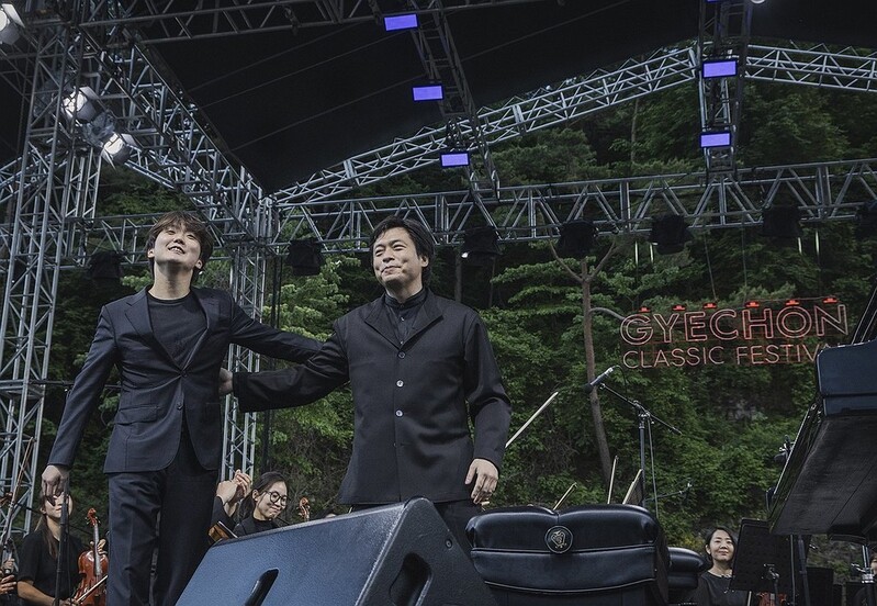 | ▲ 2024년 계촌클래식축제 (서울=연합뉴스) 지난 2일 강원도 평창군 계촌마을에서 열린 '2024년 계촌클래식축제' 때 피아니스트 조성진과 지휘자 김선옥이 관람객들에게 인사를 하고 있다. 2024.6.3 [현대차정몽구재단 제공. 재판매 및 DB 금지] photo@yna.co.kr |
