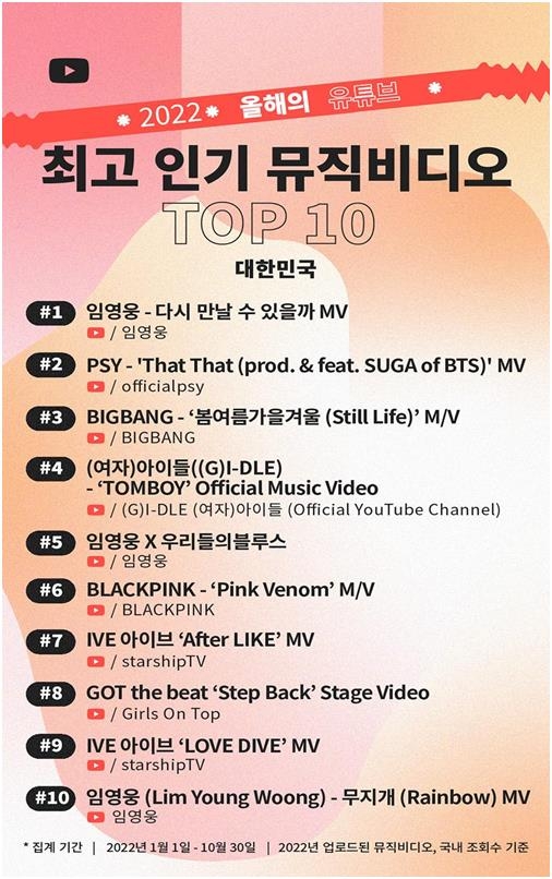최고 인기 뮤직비디오는 가수 임영웅의 '다시 만날 수 있을까'가 차지했다. 작년에 이어 2년 연속 1위를 차지한 임영웅은 이 밖에도 동명의 드라마 OST(오리지널사운드트랙)로 주목받은 '우리들의 블루스', '무지개'도 각각 5, 10위에 올렸다.