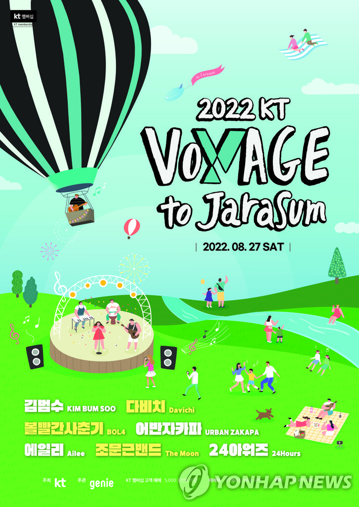 ▲ KT[030200]는 27일 경기도 가평군 자라섬에서 고객을 위한 문화 축제 '2022 보야지 투 자라섬(VOYAGE to Jarasum)'을 개최한다. 3년 만에 열리는 이번 행사에는 김범수, 에일리, 어반자카파, 다비치, 볼빨간사춘기, 조문근밴드, 24아워즈 등 뮤지션 7팀이 공연할 예정이다. 티켓은 5일 오전 10시부터 KT 홈페이지와 'KT 멤버십' 애플리케이션에서 예매할 수 있다. (서울=연합뉴스)