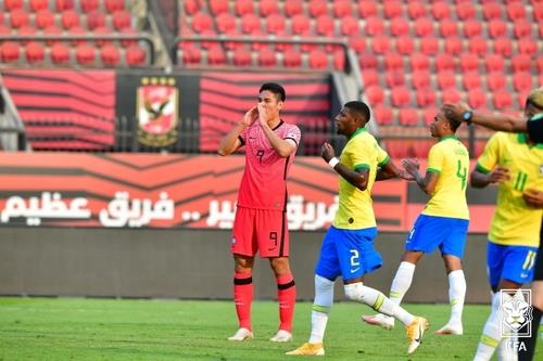 | ▲ Oh Se-hun of South Korea reacts after missing a penalty against Brazil during their under-23 men's football friendly match at Al Salam Stadium in Cairo on Nov. 14, 2020, in this photo provided by the Korea Football Association. (PHOTO NOT FOR SALE) (Yonhap) |