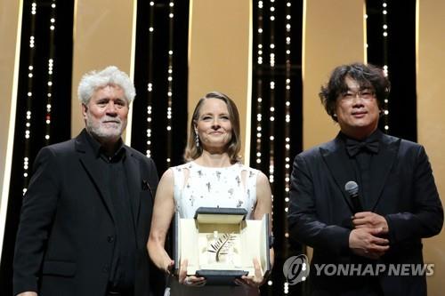 | ▲ 페드로 알모도바르 감독, 조디 포스터, 봉준호 감독 조디 포스터에게 칸영화제 명예 황금종려상을 시상한 알모도바르 감독(왼쪽)과 봉준호 감독. 두 사람은 9월 열리는 베네치아 영화제 개막작 감독과 심사위원장으로 다시 만난다. [AFP=연합뉴스] |