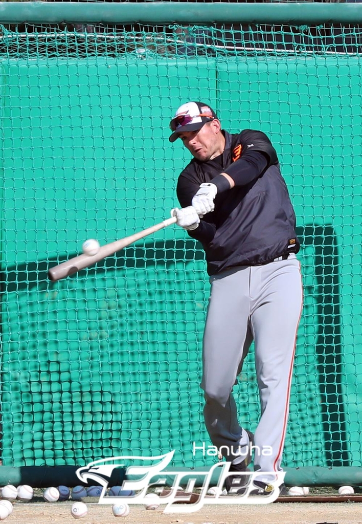 ▲ Ryon Healy of the Hanwha Eagles takes a swing during batting practice at Hacheong Sports Town in Geoje, South Gyeongsang Province, on Feb. 4, 2021, in this photo provided by the Eagles. (PHOTO NOT FOR SALE) (Yonhap)