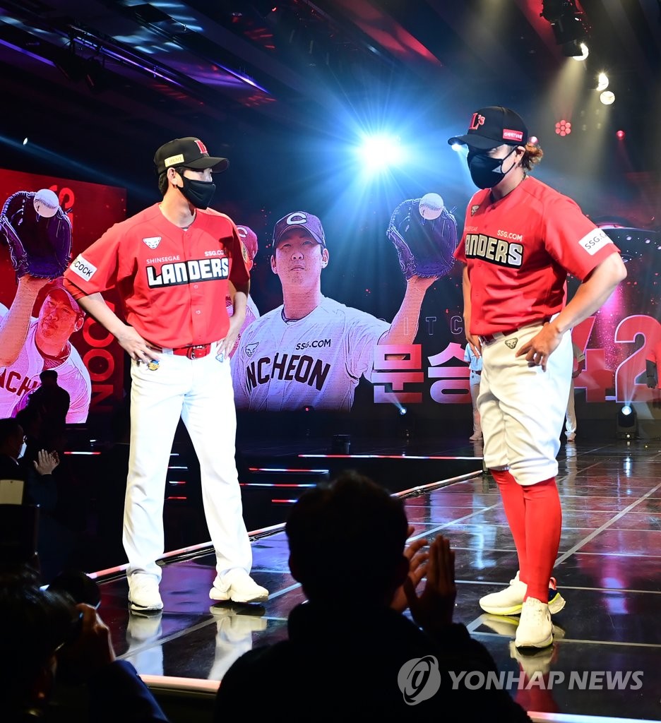 | ▲ Mooon Seung-won (L) and Choo Shin-soo of the SSG Landers pose in the club's new road uniforms during a ceremony in Seoul on March 30, 2021. (Yonhap) |