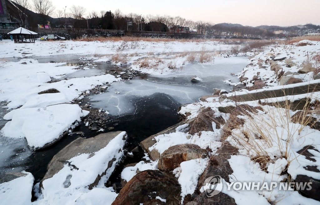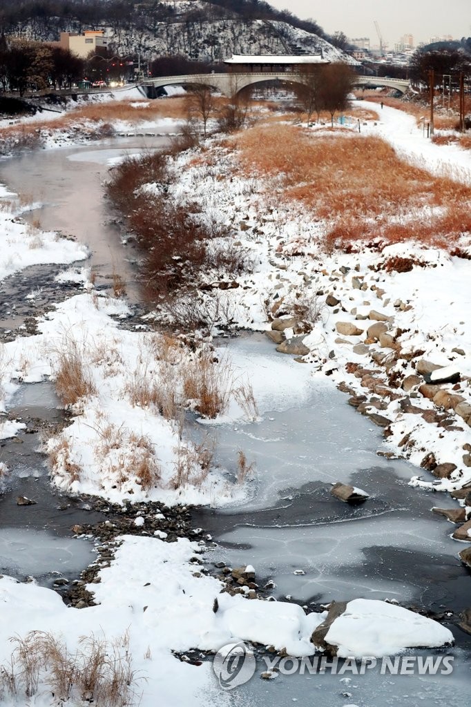 | ▲ '전주천이 얼었어' (전주=연합뉴스) 정경재 기자 = 8일 오전 한파경보가 내려진 전북 전주시 전주천이 얼어붙어 있다. 2021.1.8 jaya@yna.co.kr |