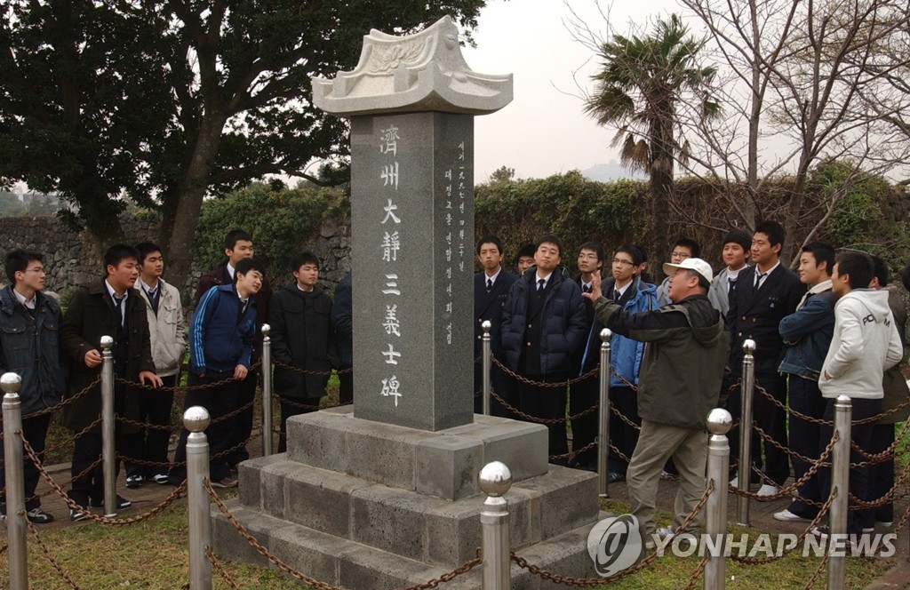 | ▲ 제주대정삼의사비 (제주=연합뉴스) 1901년 발생한 민란의 세 장두 이재수·오대현·강우백을 기려 1997년 대정청년회에 의해 새로 건립된 '제주대정삼의사비'. 1961년 세워졌던 기존 비의 명칭은 '제주대정군삼의사비'였다. [연합뉴스 자료사진] |