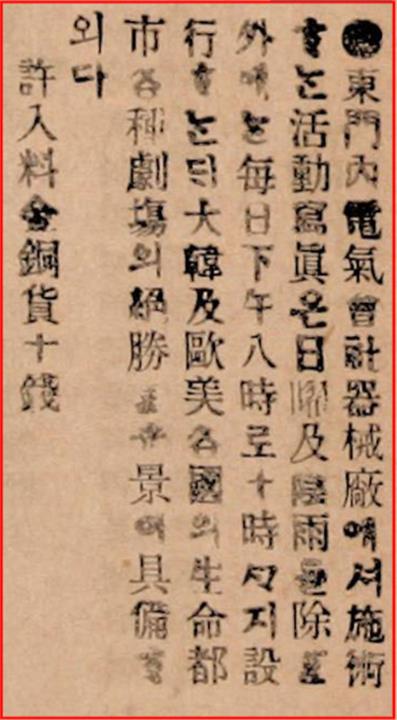 당시 신문에 실린 작은 광고는 '동대문 내 전기회사 기계창에서 상영하는 활동사진은 일요일 및 비 오는 날을 제외하고는 매일 오후 8시부터 10시까지 상영한다'고 안내한다.