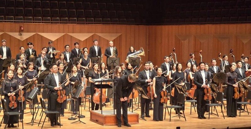 | ▲ 공연을 마치고 관객에게 인사하는 바실리 페트렌코와 서울시향 단원들 (서울=연합뉴스) 영국 로열 필하모닉 오케스트라 음악감독 바실리 페트렌코와 서울시향 단원들이 21일 예술의전당 콘서트홀에서 드보르자크 교향곡 8번 연주를 마치고 관객에게 인사하고 있다. 2024.06.21 hyun@yna.co.kr |