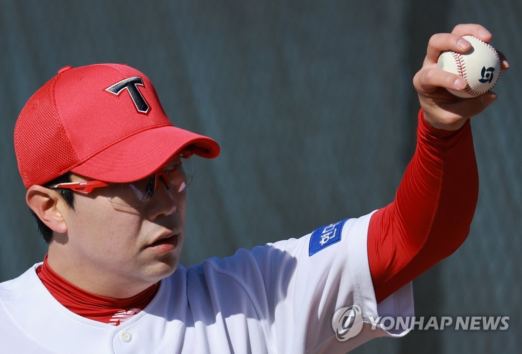 | ▲ Yang Hyeon-jong of the Kia Tigers grips the official ball for the World Baseball Classic at Kino Sports Complex in Tucson, Arizona, on Feb. 14, 2023, during the club's spring training. (Yonhap) |