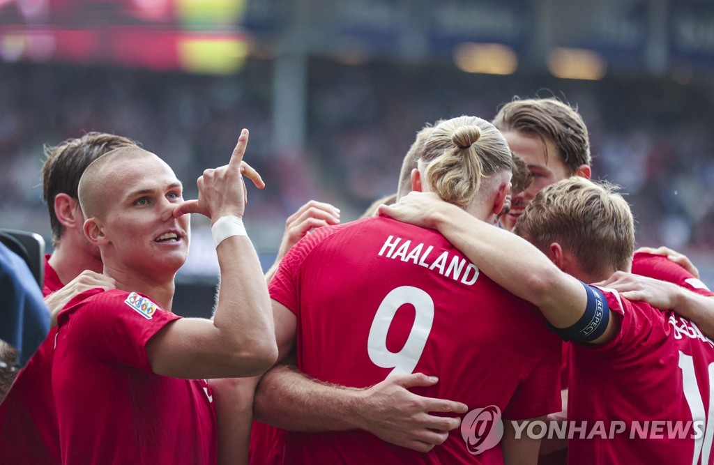 | ▲ 홀란의 득점을 축하하는 노르웨이 팀 동료들 [AFP=연합뉴스] |